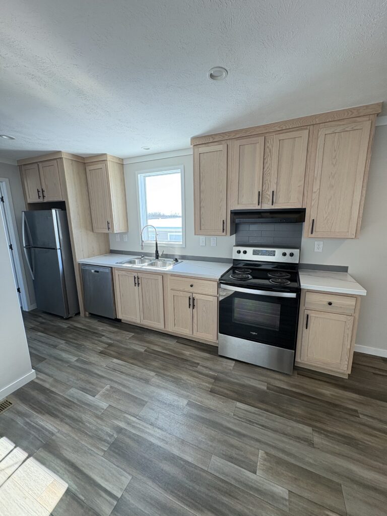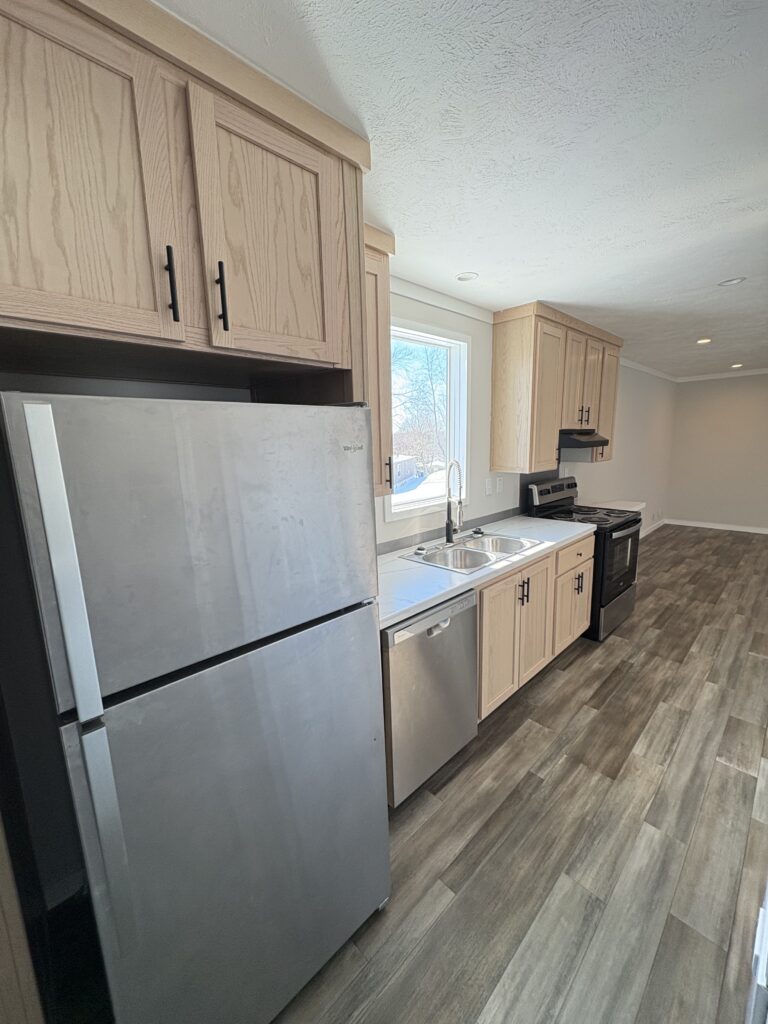 The kitchen comes fully equipped with a refrigerator, stove/oven, and dishwasher, plus generous cabinet and counter space — perfect for cooking and entertaining. The living area flows seamlessly from the kitchen, creating a warm and functional gathering space.
